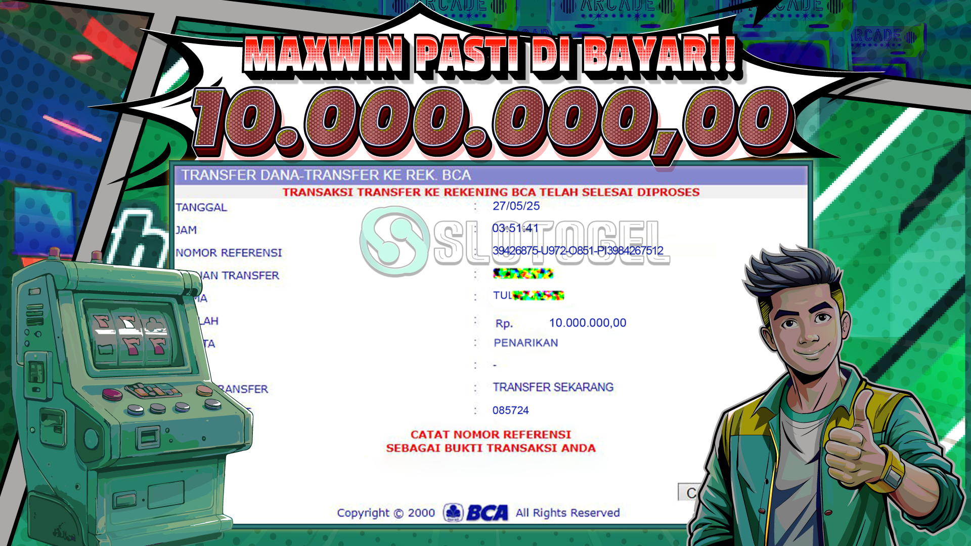 Pemain yang menang dikenal dengan inisial “TU”. Siapa sangka, hanya dengan modal deposit Rp 20.000,-, ia berhasil membawa pulang Rp 10 juta!